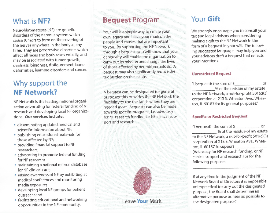 NF Network is committed to helping you make the best decision to meet your personal, financial and charitable objectives at the same time. Together we can leave a mark and plan for a future that includes treatments and a cure for neurofibromatosis.